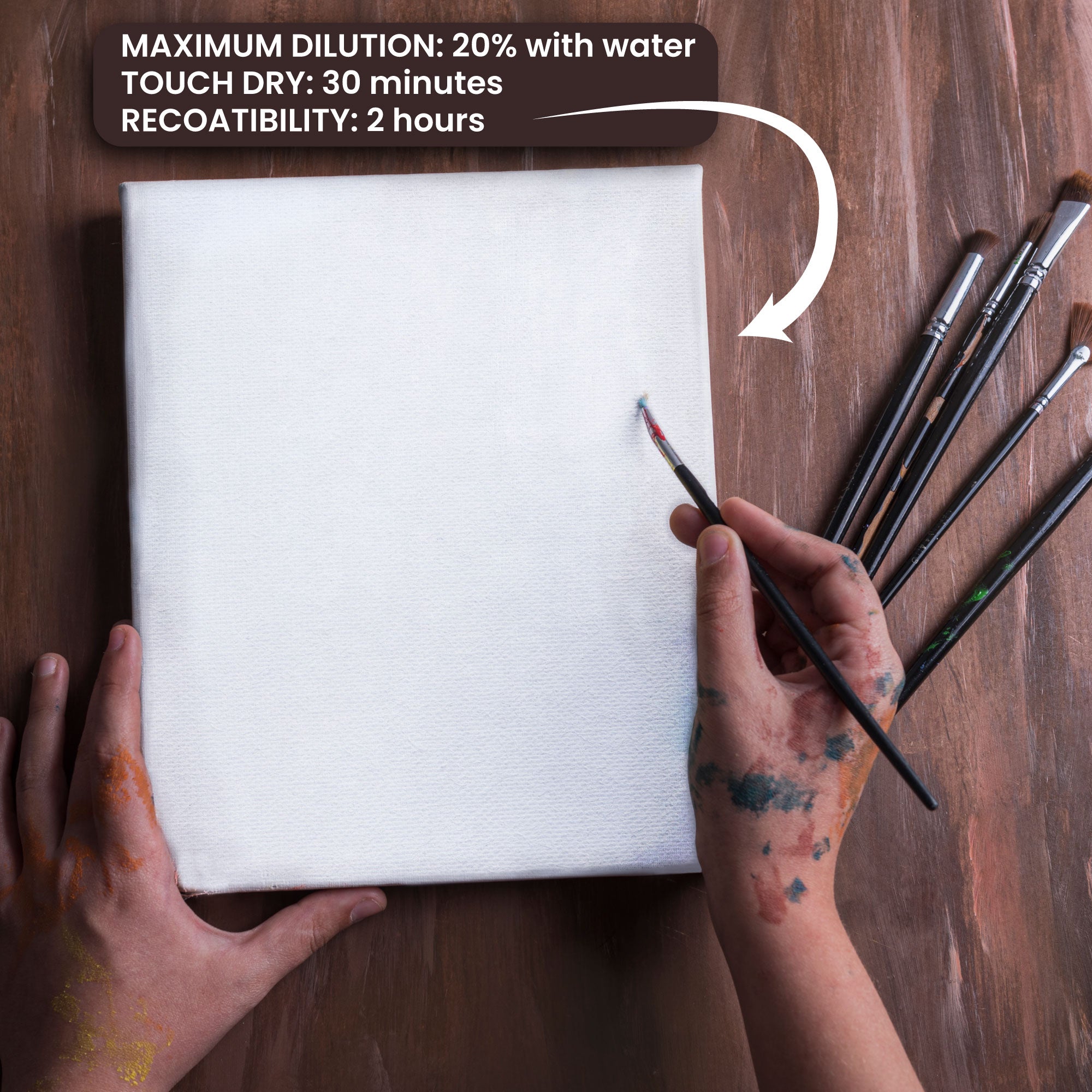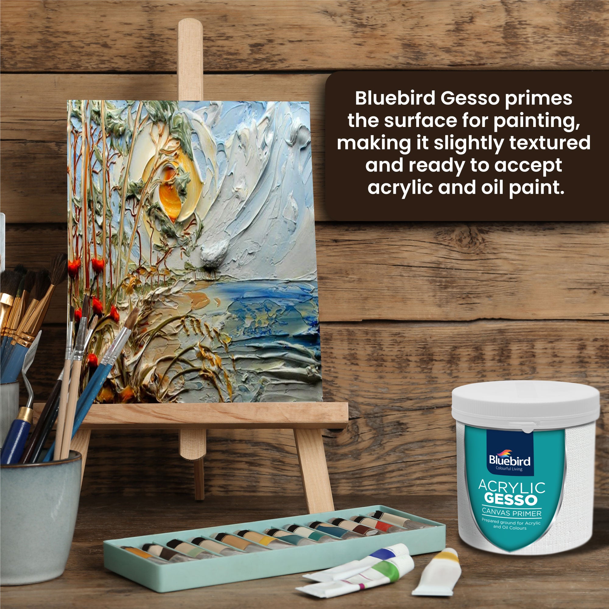 The key role of Bluebird Gesso is to prime the painting surface, creating a slightly textured base that optimally accepts and for both acrylic and oil paints. This is crucial in preventing the paint from soaking into the weave of the canvas, allowing you to achieve vibrant and defined brushstrokes without the colors being absorbed unevenly.