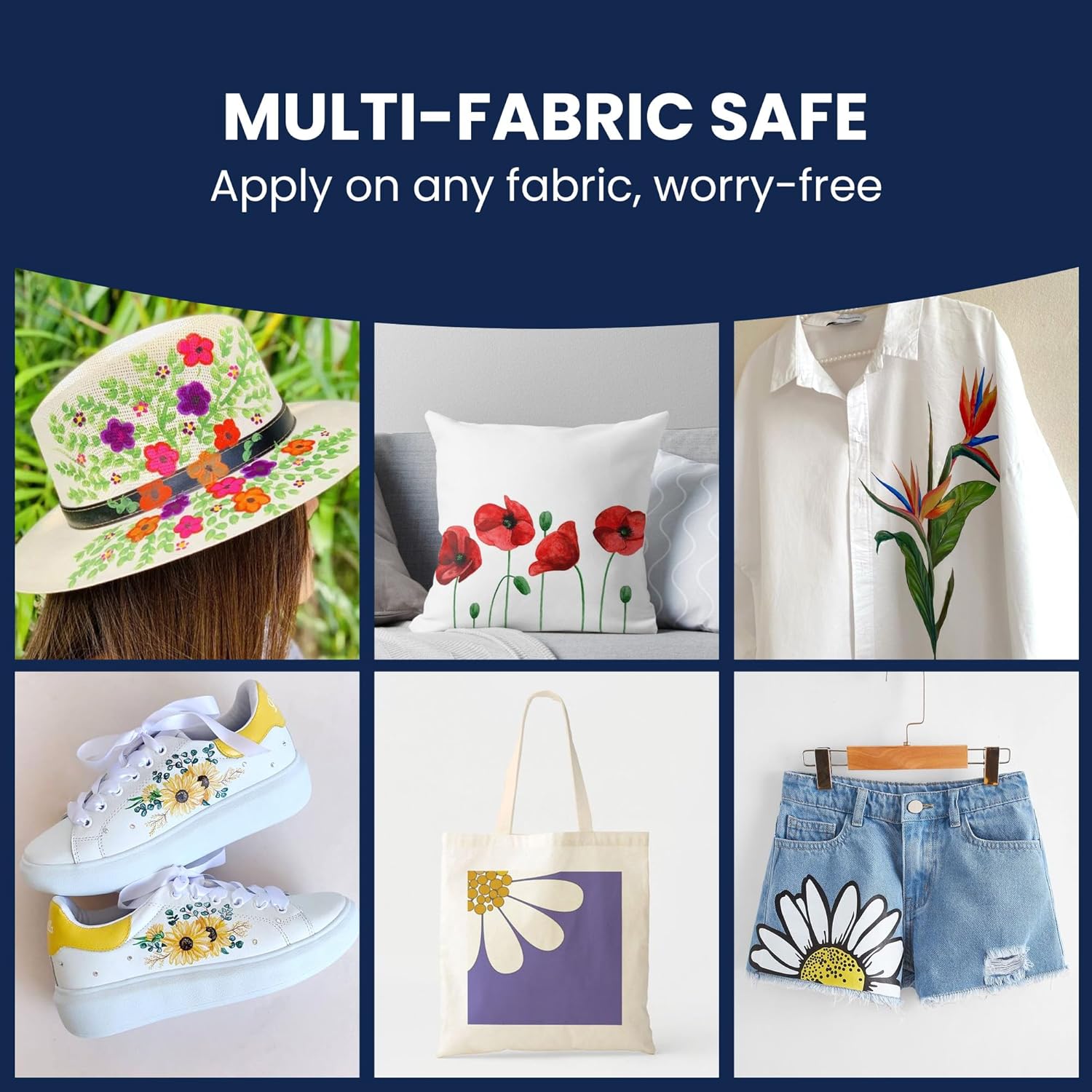 MULTIPLE PURPOSES: Premium textile paint with bright colors performs well on both light and deep color fabrics, applicable for both synthetic and natural fibers, ideal for T-shirts, jeans, bags, shoes, caps, pillowcases and other DIY projects and crafting.