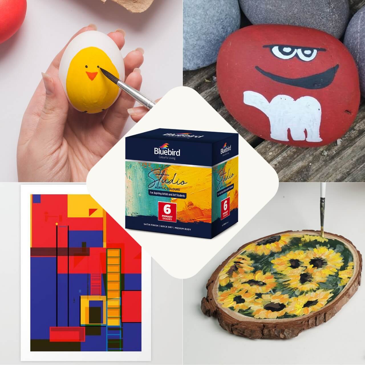 I really love ur products particularly paints quality of paint so vibrant... Quantity is much more than price of product.. brushes quality also good... In future bluebird will b my only choice